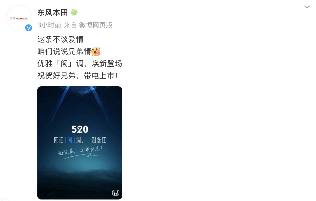 在自主品牌抱团逆袭的中国汽车市场,5月20日,广汽本田全新雅阁上市,而东风本田官方账号在第一时间进行了祝贺。此次互动也是东风本田和广汽本田为数不多的几次官方互动。